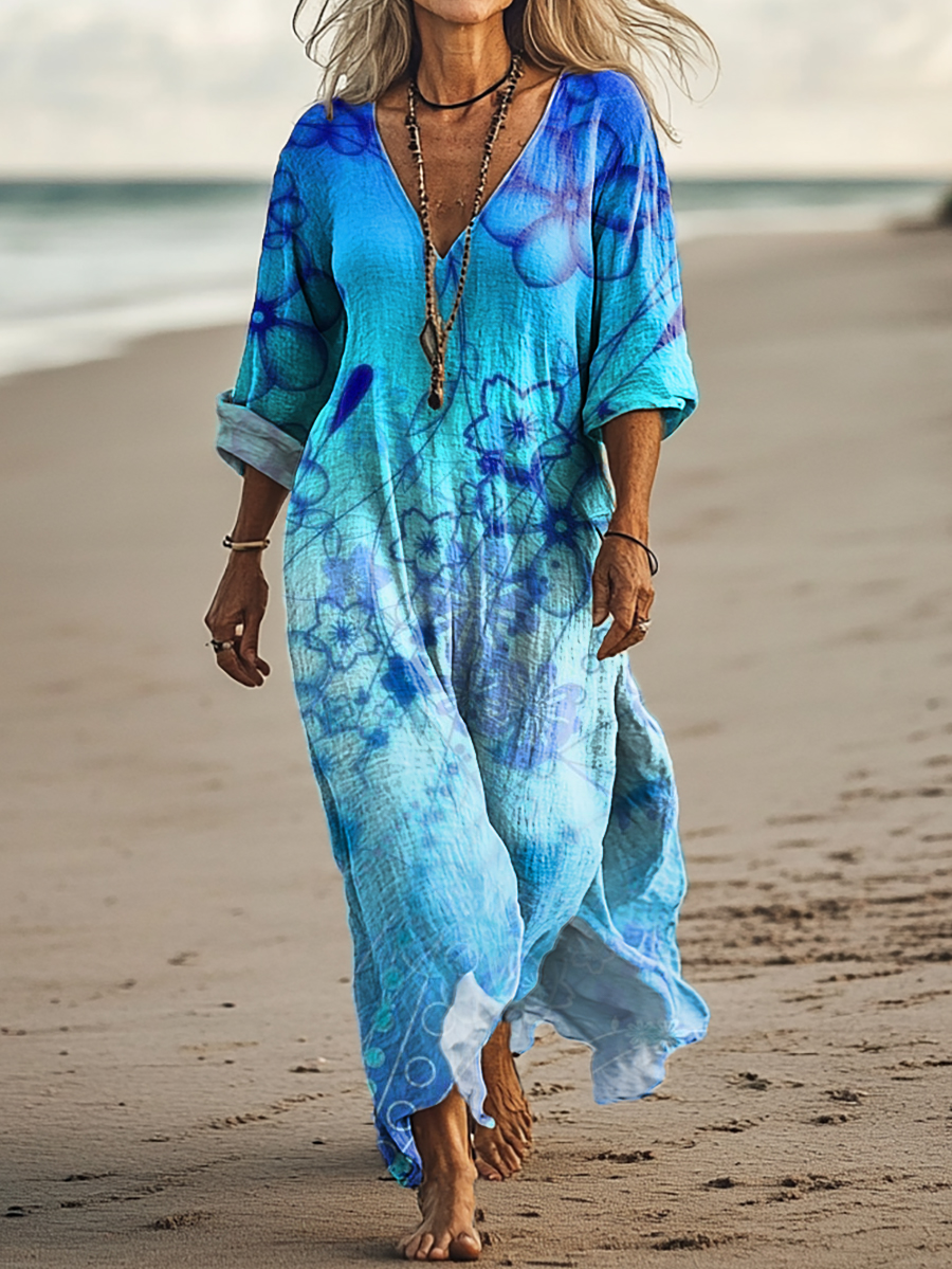 Women's Boho Floral Art Print Casual V-Neck Pocket Cotton Dress