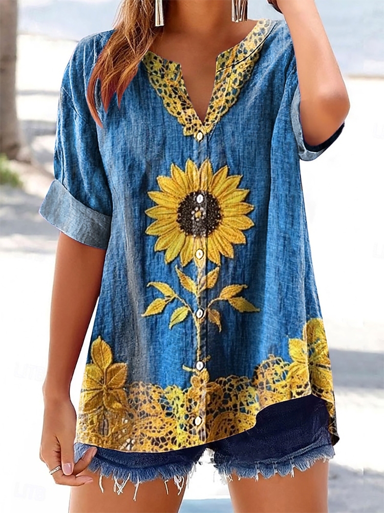 Women's Floral Pattern Art Print Cotton Linen Casual Shirt