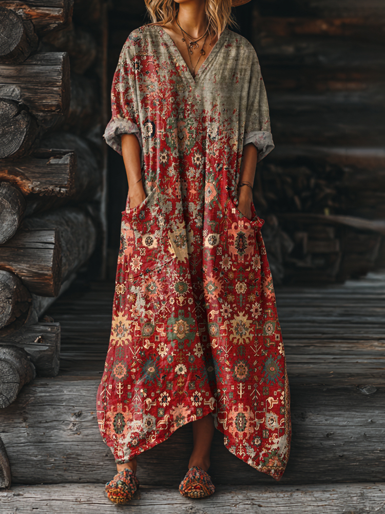 Women's Retro Ethnic Totem Art Pattern Print Pocket V-neck Cotton Dress