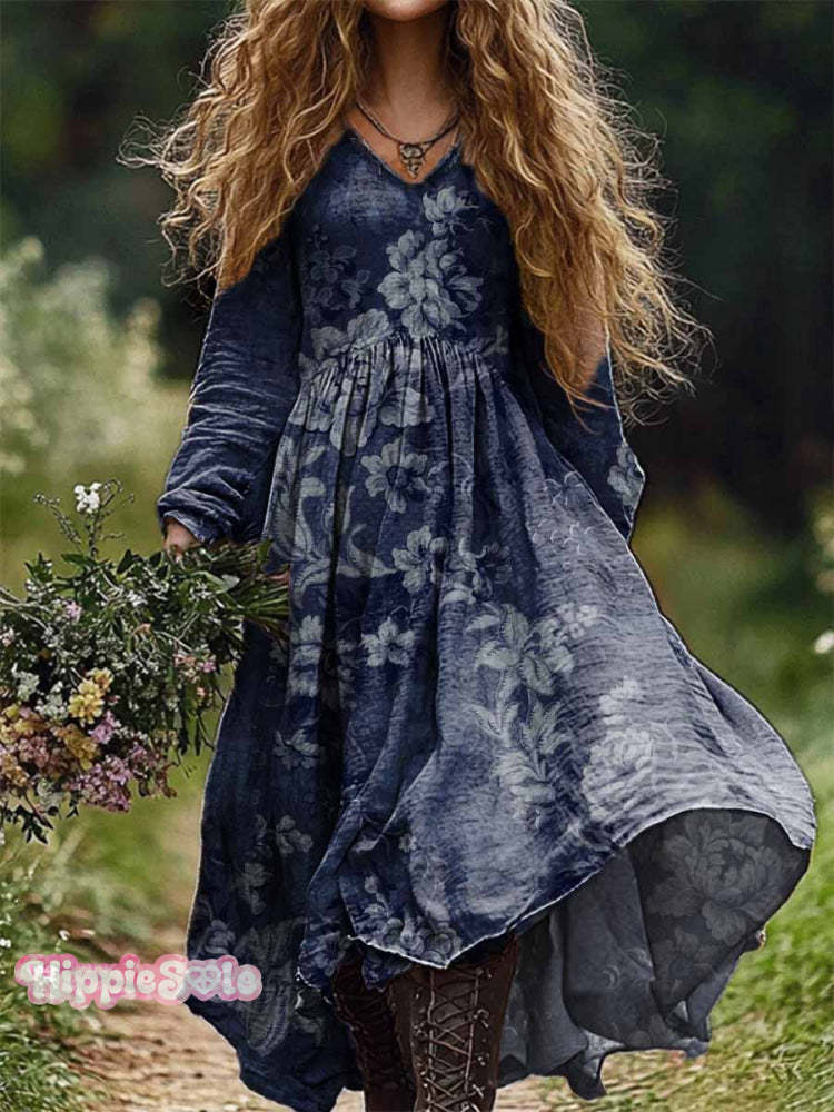 Women's Vintage Floral Print Casual V-Neck Pocket Cotton Dress